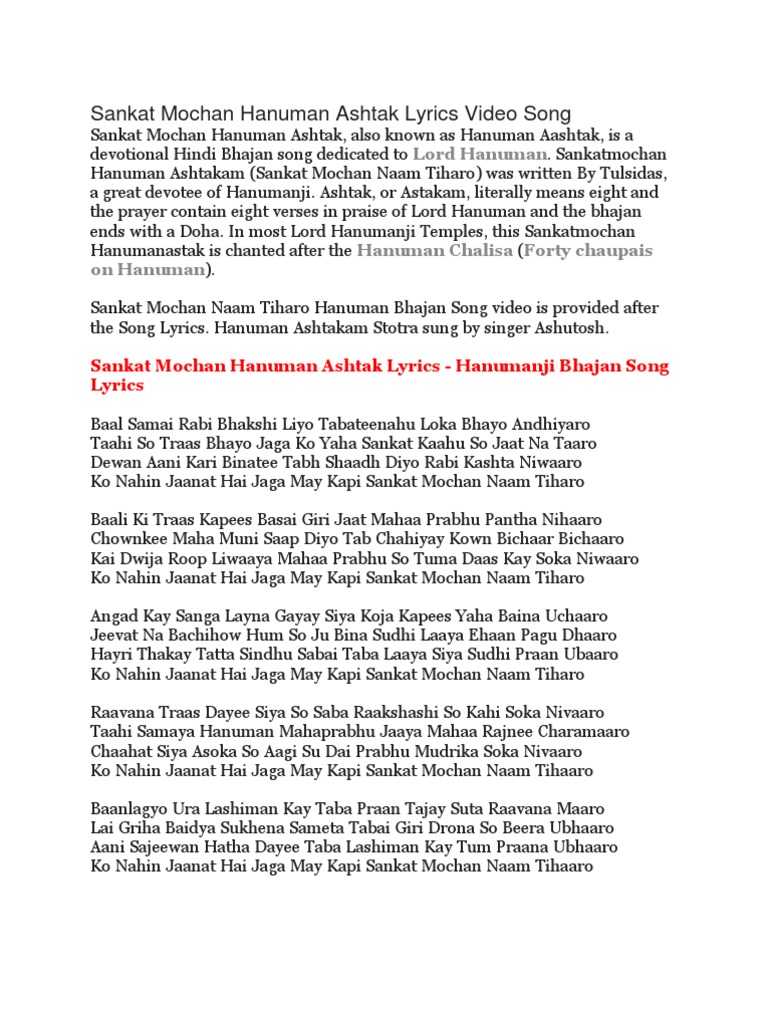 Hanuman Ashtak In Hindi - Hanuman ashtak lyrics, hanuman ashtak in hindi, bal samay ravi, संकट मोचन हनुमानाष्टक के फायदे, संकटमोचन हनुमानाष्टक lyrics, sankatmochan hanuman ashtak benefits. Hanuman Ashtak In Hindi : Hanuman ashtak is a hindi album released on apr 2019.