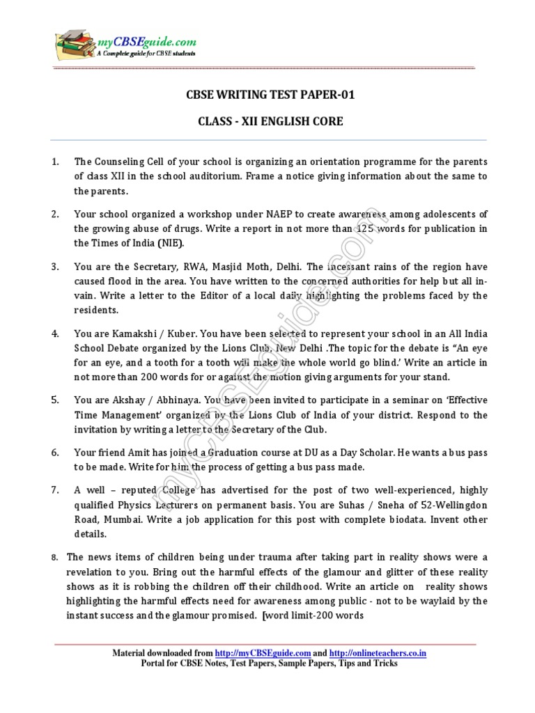 12 English Core Writing Test 01 - Looking for cbse class 11 history course material designed by mycbseguide.com includes syllabus, question papers, online tests and important questions as per cbse syllabus.
